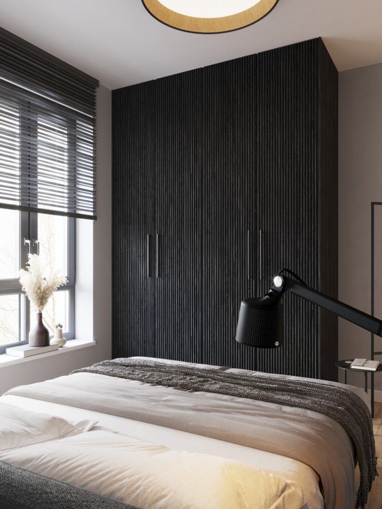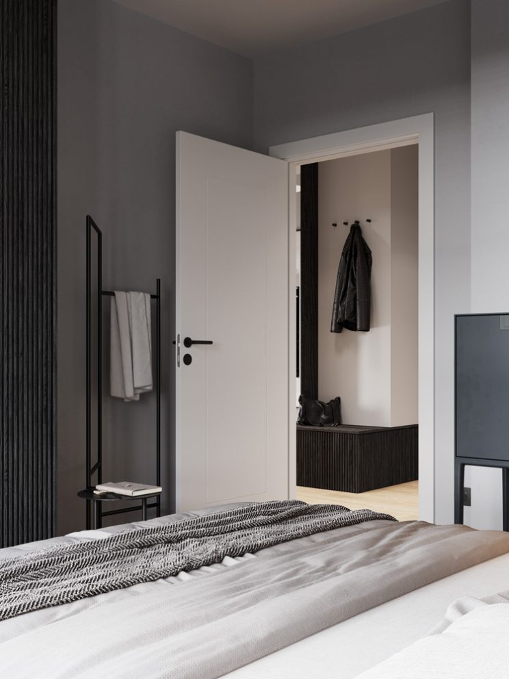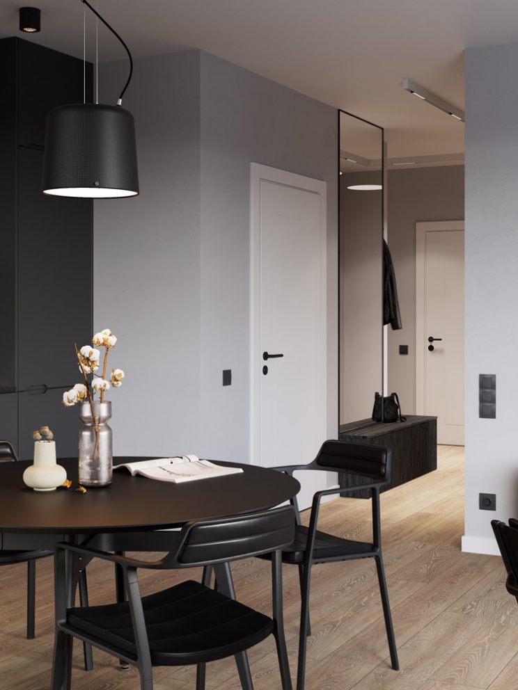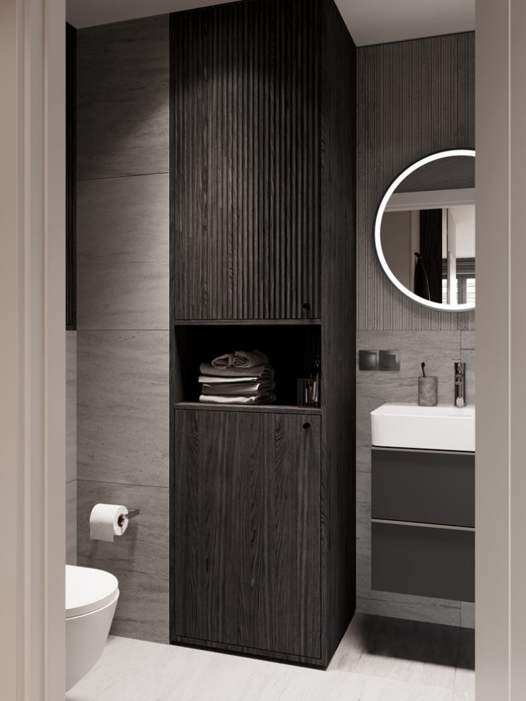 Vinyl panels – light oak color. Light grey wall color. In the bathroom – tiles with a delicate, stone pattern, decorative tiles with vertical rifling. Kitchen comes in a graphite color, with tabletops made out of matching agglomerated stone. Upper cupboards come in a light gray color. The interior doors are white, with a smooth grooved pattern.