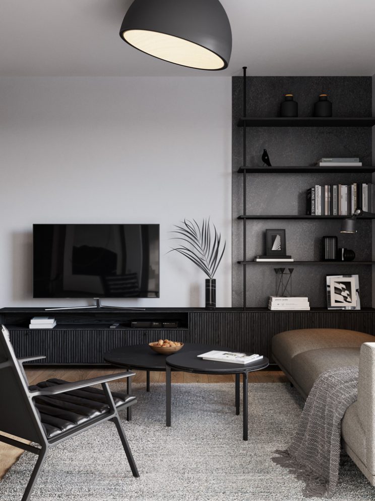 • At least two light points on the ceiling. On-ceiling light fixtures in a black color,