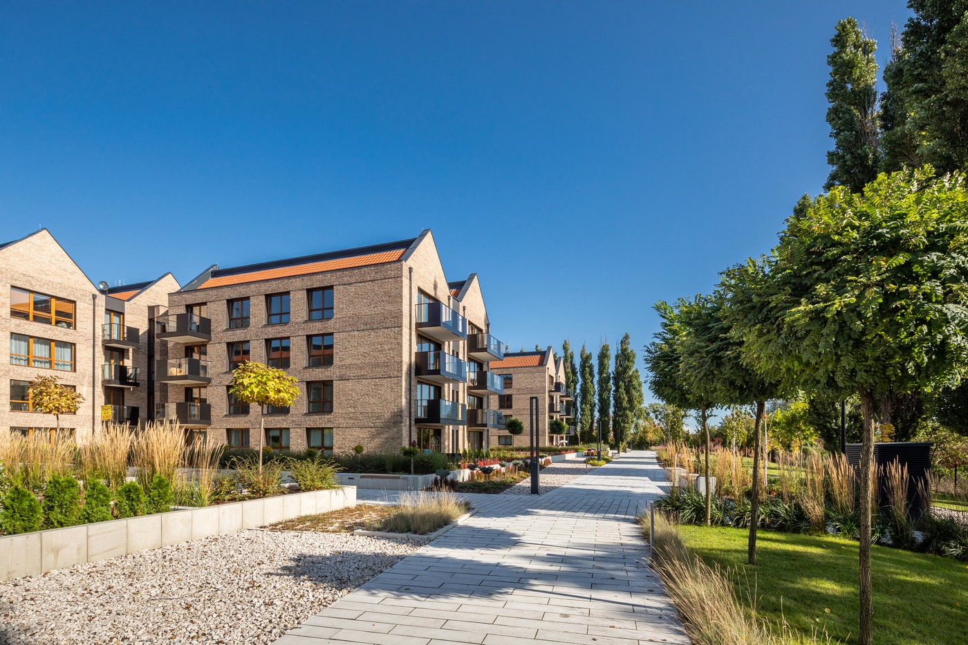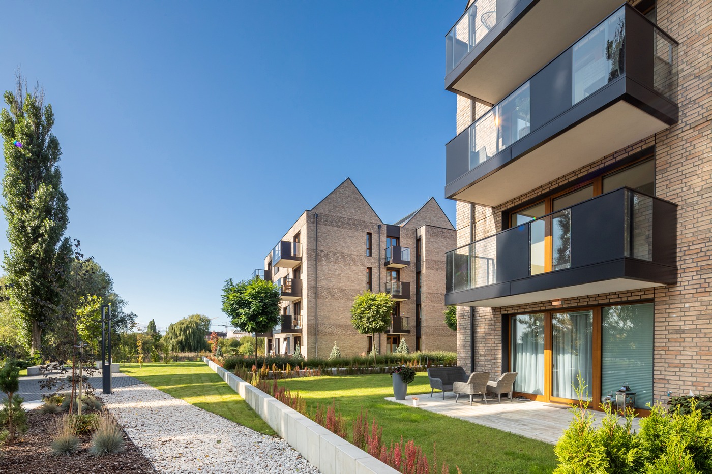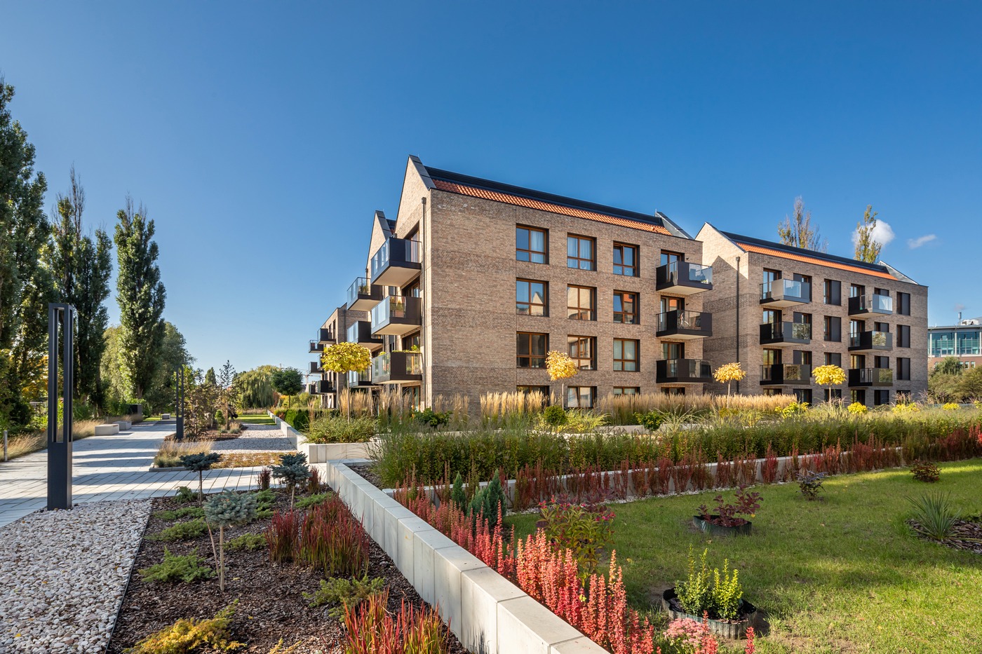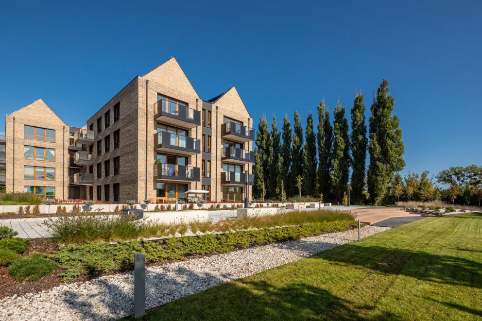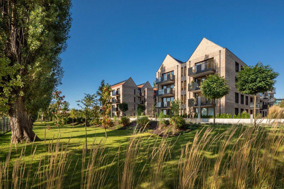 Z prawdziwym parkiem, ogrodową roślinnością, w otoczeniu zielonych tras rekreacyjnych Opływu Motławy.