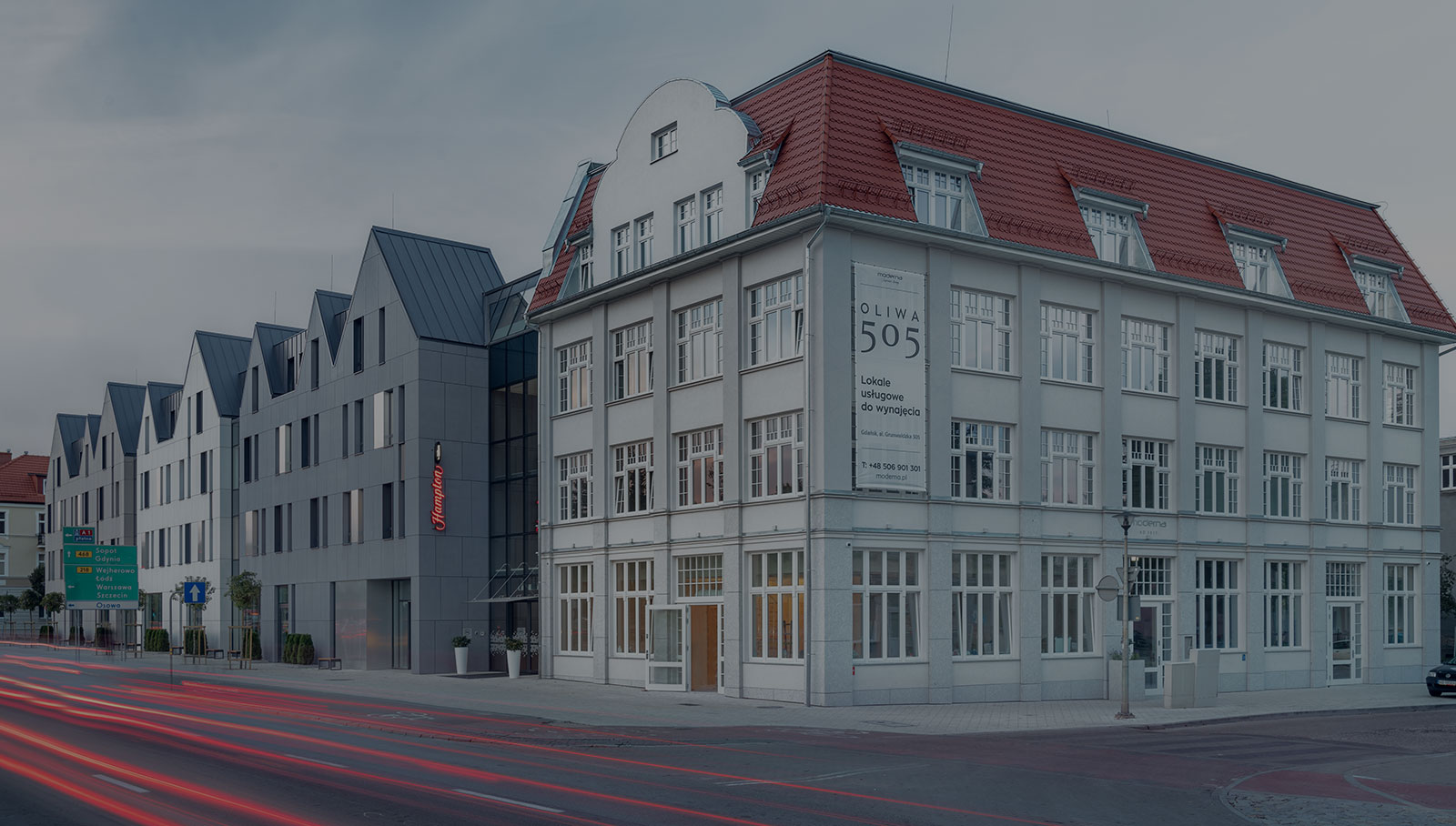 Oliwa 505 położona jest w urokliwej dzielnicy Gdańska – Oliwie, na granicy z miastem Sopot. Dzielnica słynie m.in. z przepięknej Archikatedry oraz graniczącego z nią XVI-wiecznego parku. Kompleks ten znajduje się w odległości 170-metrów od dworca kolejowego PKP oraz peronu Szybkiej Kolei Miejskiej. Wystarczy z Oliwy 505 przejść przez aleję Grunwaldzką na drugą stronę, by dotrzeć do przystanków pętli trawmajowej i autobusowej, oferujących sprawny dojazd do Centrum, na plażę i w wiele innych miejsc w Gdańsku.