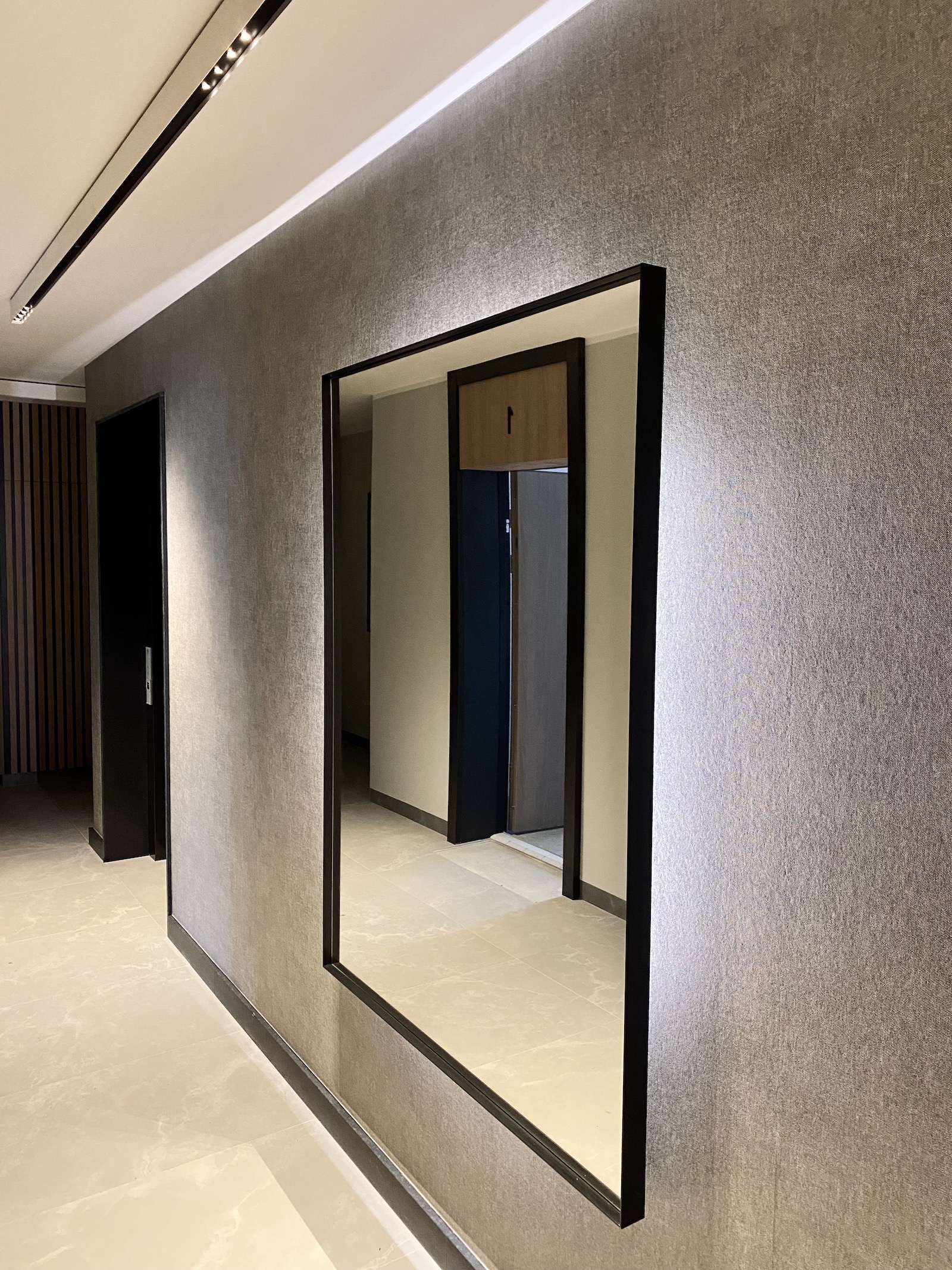 Elegancki wystrój wnętrza uzyskano poprzez zastosowanie stonowanych ponadczasowych materiałów, podkreślonych lamelami w naturalnym dębowym fornirze i tekstylną tapetą.