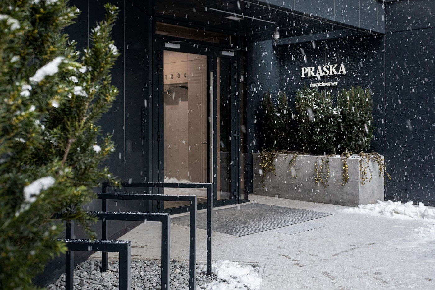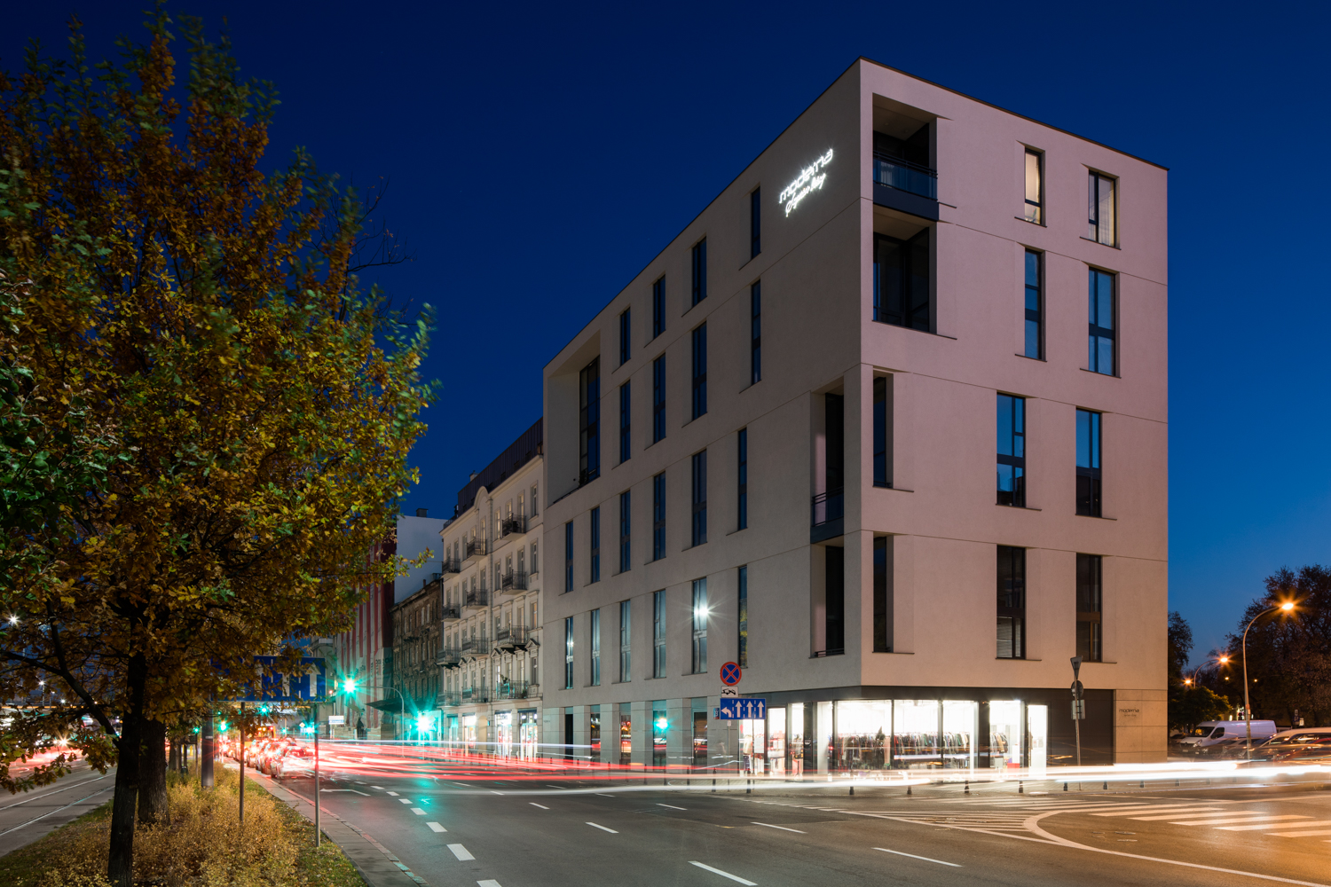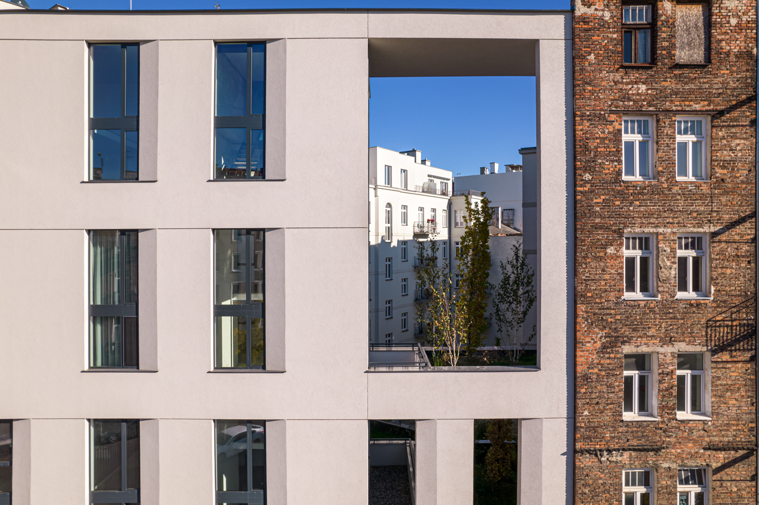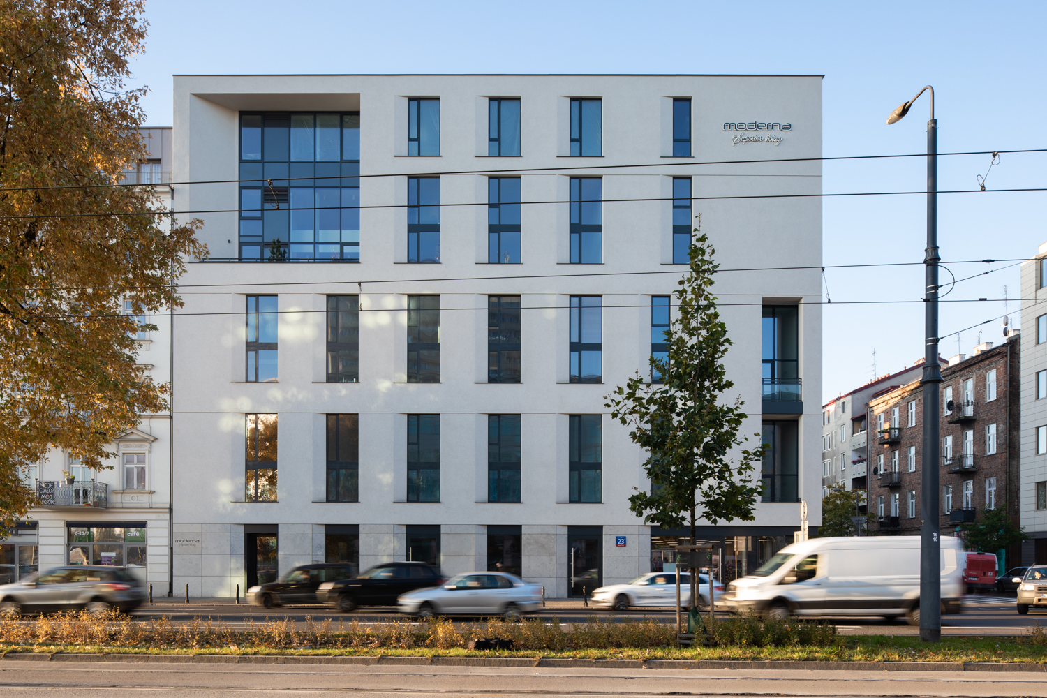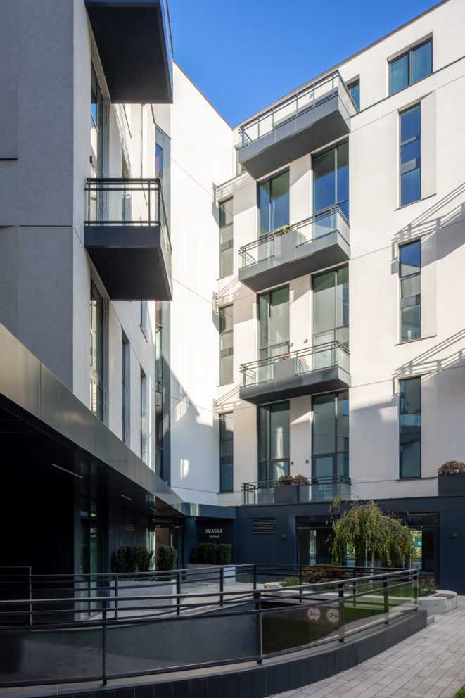 W tym otoczeniu wyrasta odważna sylwetka Praskiej Moderny. I choć jej powściągliwa, jasna fasada z szacunkiem wkomponowuje się w miejski rytm zachodniej pierzei, to otwarta, modernistyczna bryła przyciąga uwagę, nie pozwalając przejść obojętnie.